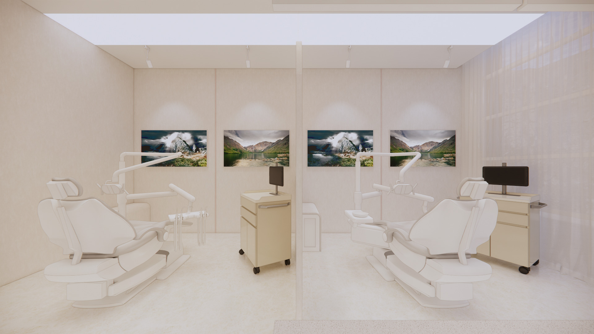 每張治療椅之間以 半透光的波浪造型隔板做分隔,保有隱私又不顯壓迫。