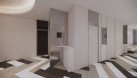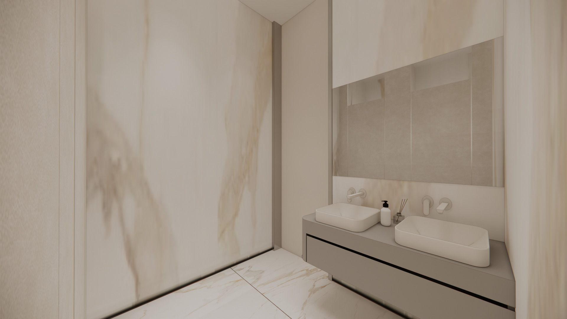 牆地面以 大理石紋材質搭配極簡鏡面與方形洗手台,延續整體空間的高級感與清新氛圍。