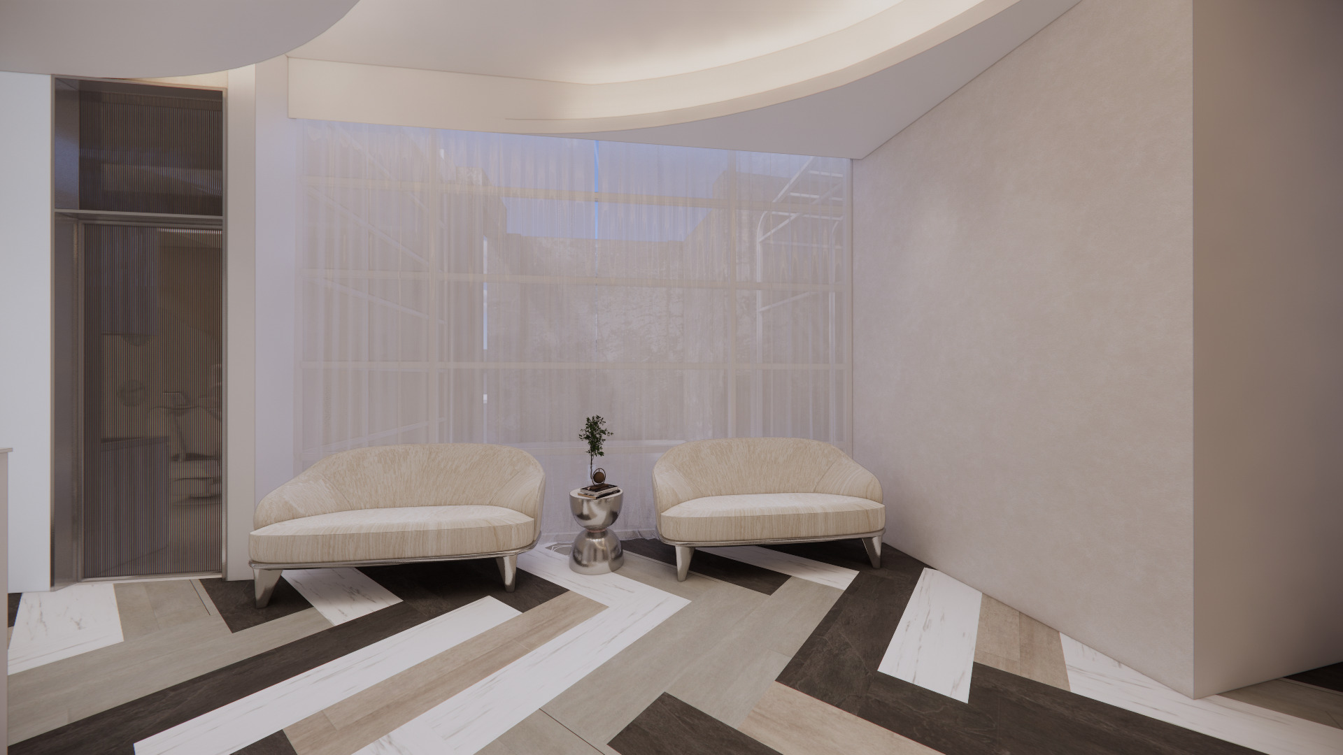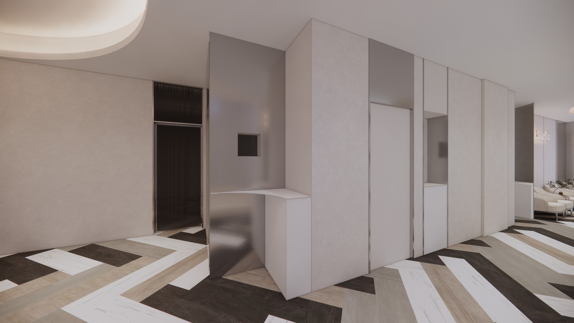 櫃台設計以 曲線造型搭配金屬光澤材質,柔化醫療空間的冰冷感,傳達親切且專業的第一印象。