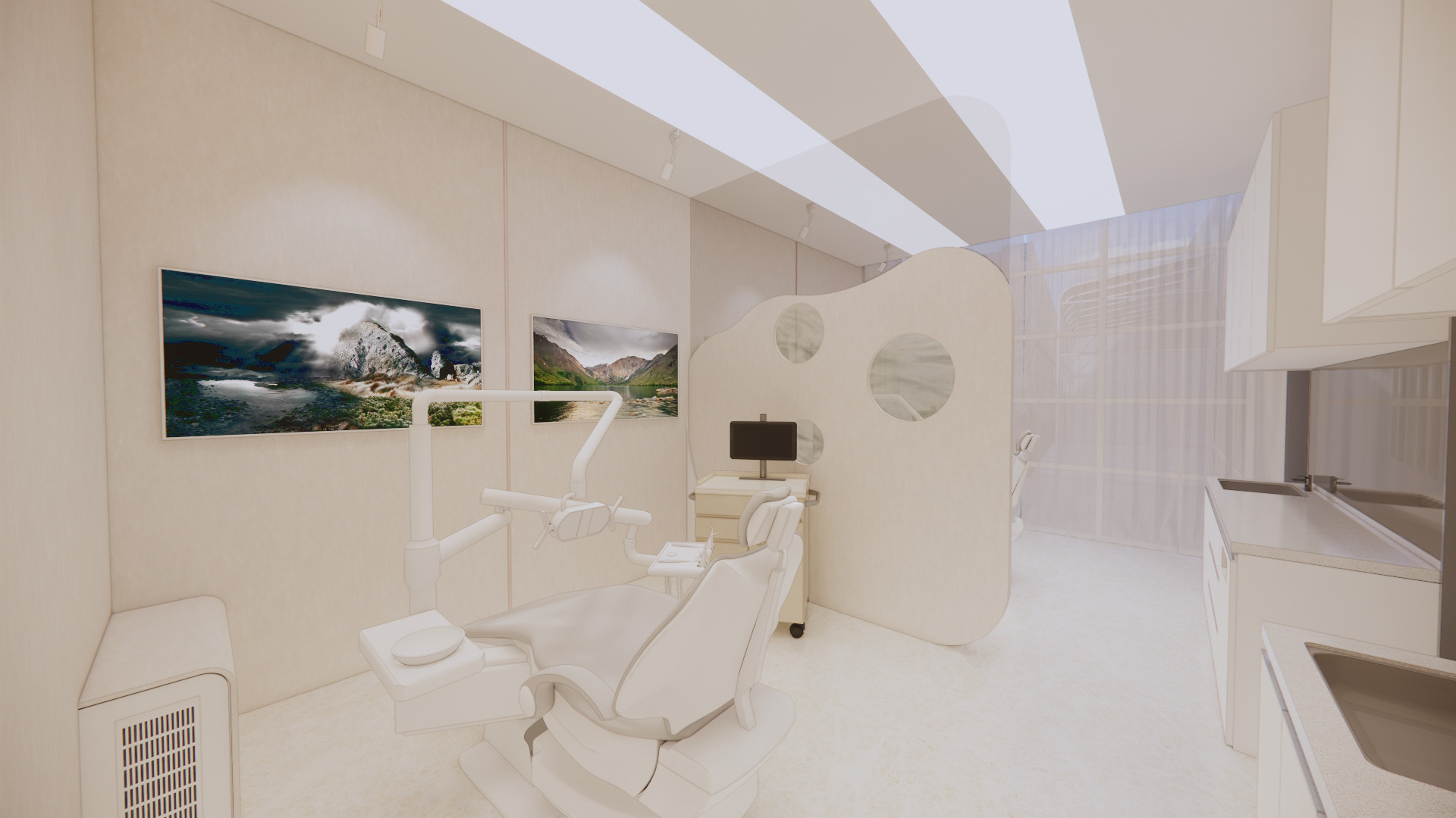 天花板設計加入 雲朵感光影天花,柔和的燈光與自然曲線,減少就診焦慮,創造療癒氛圍。