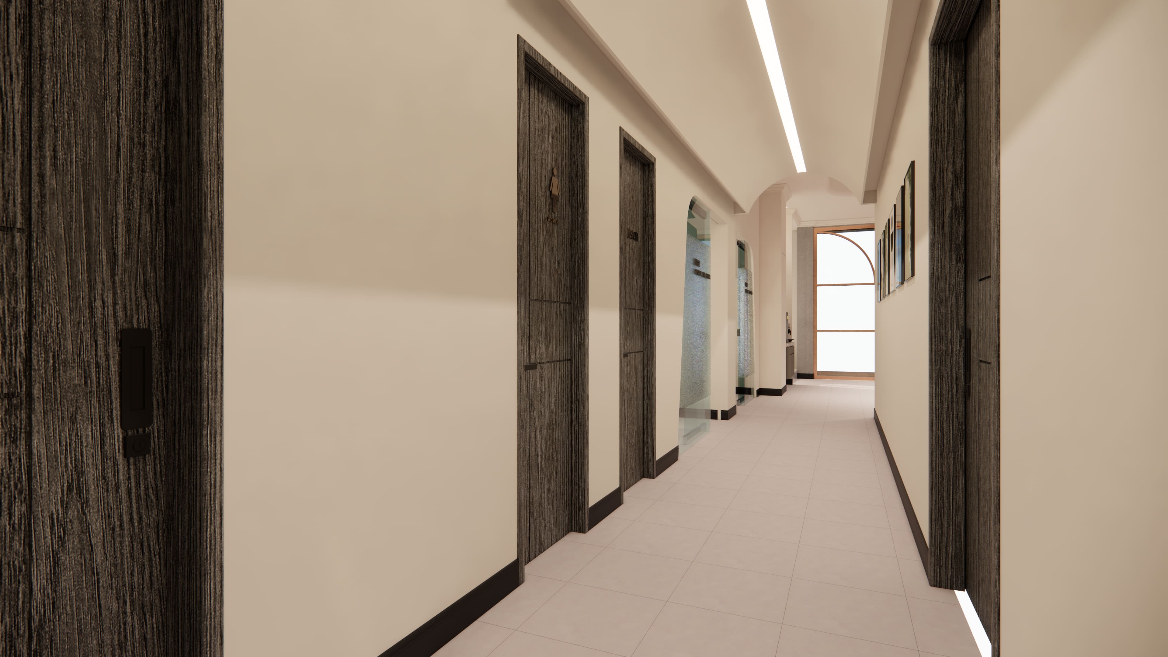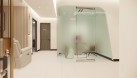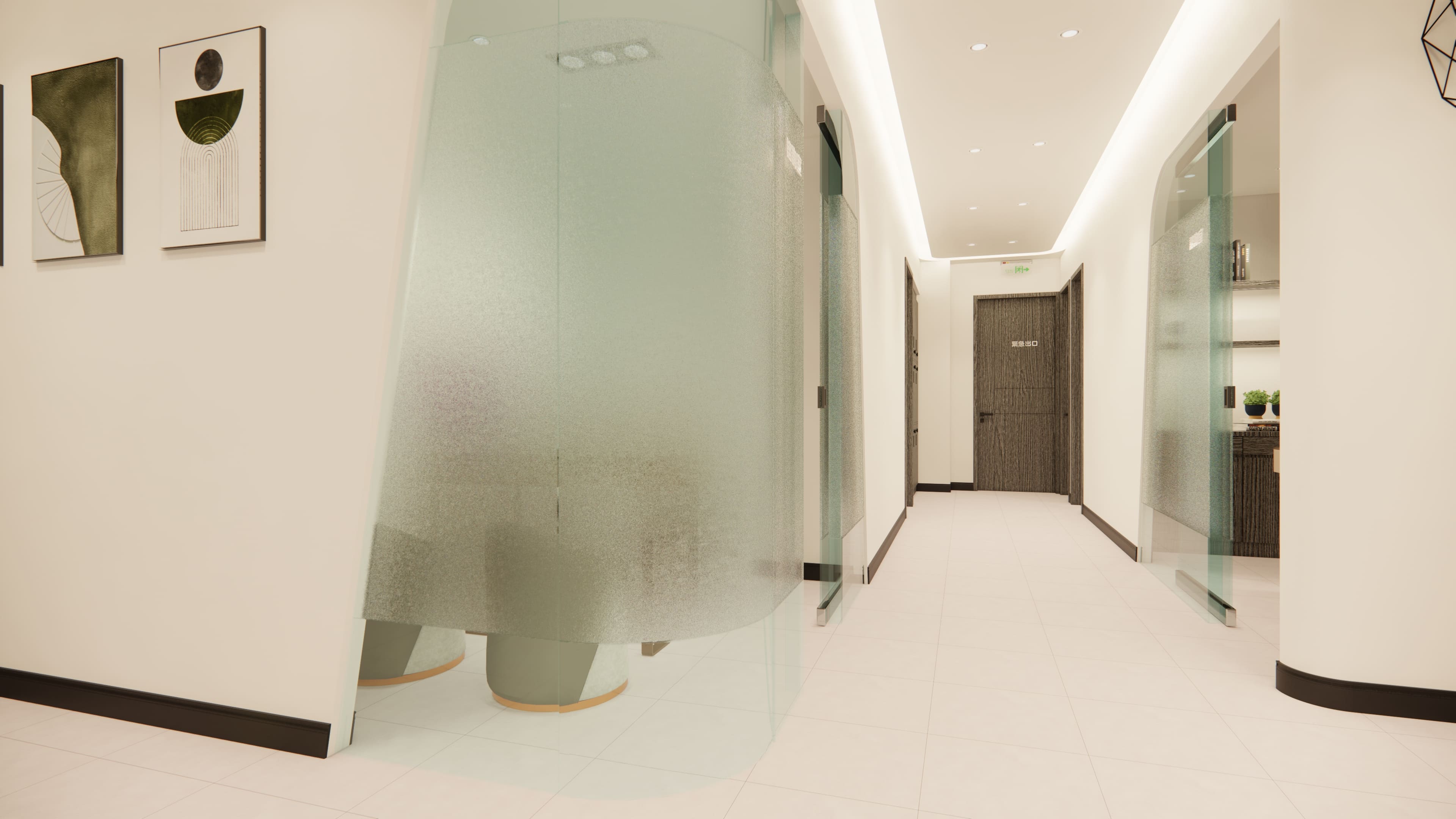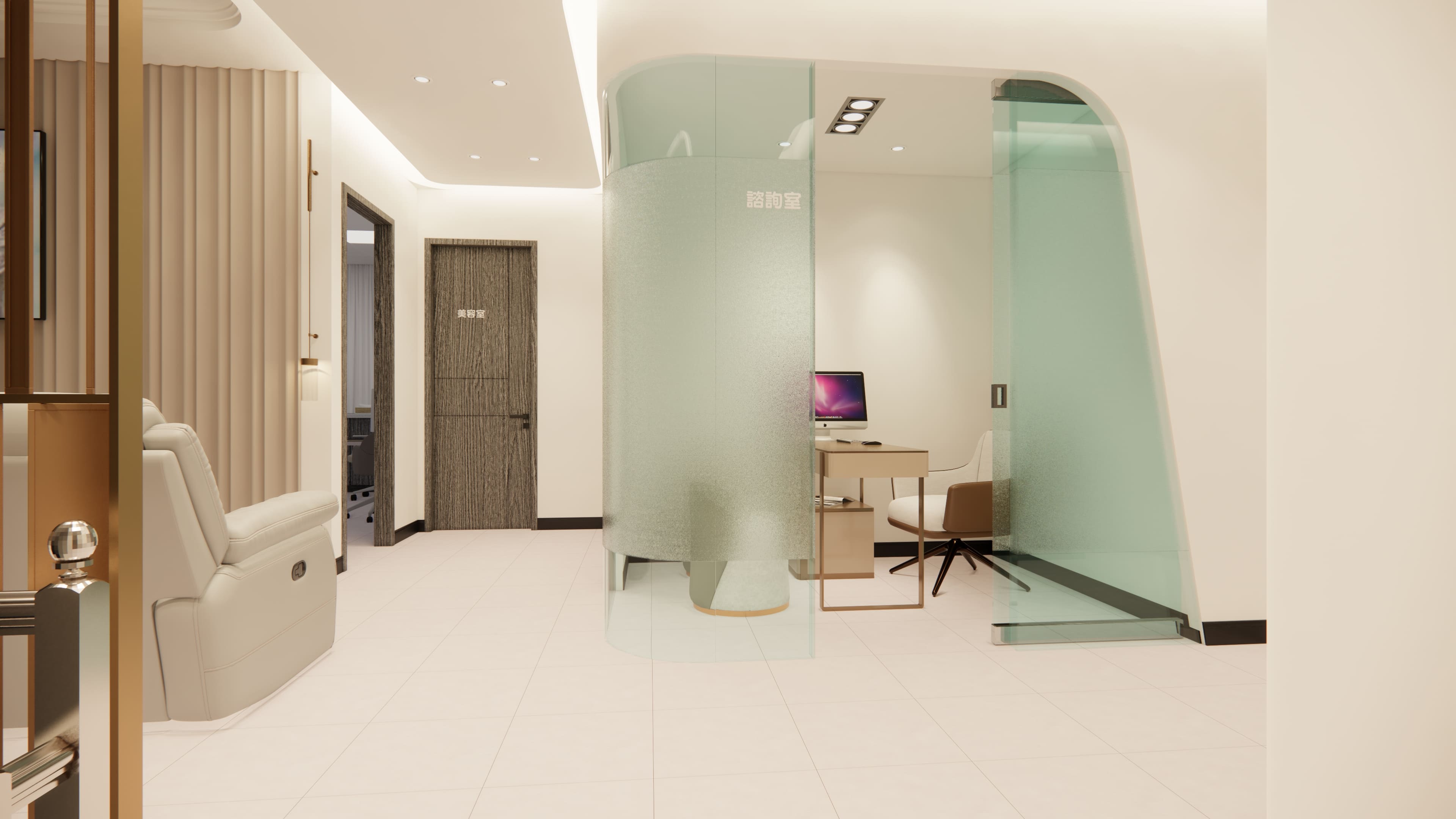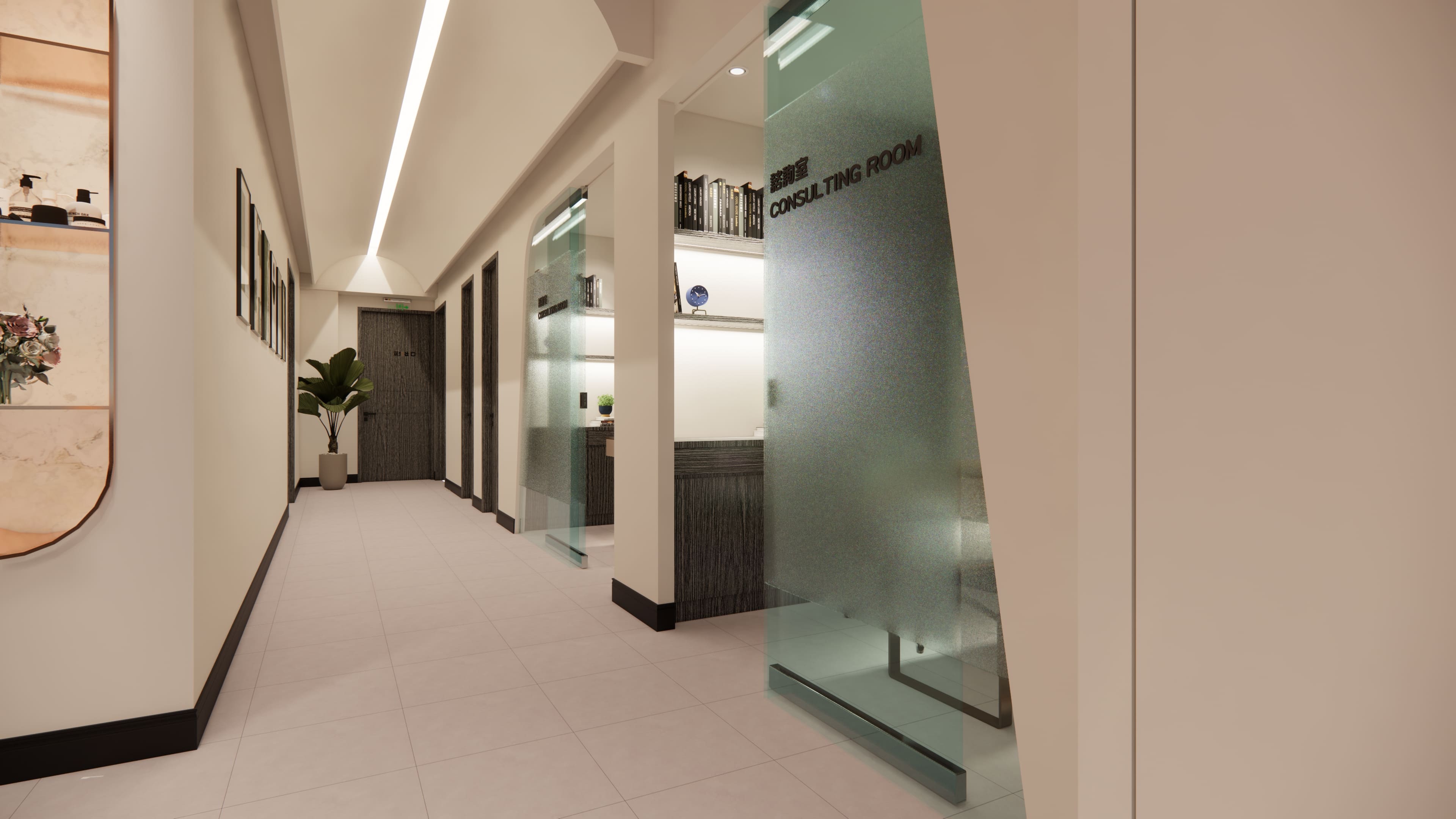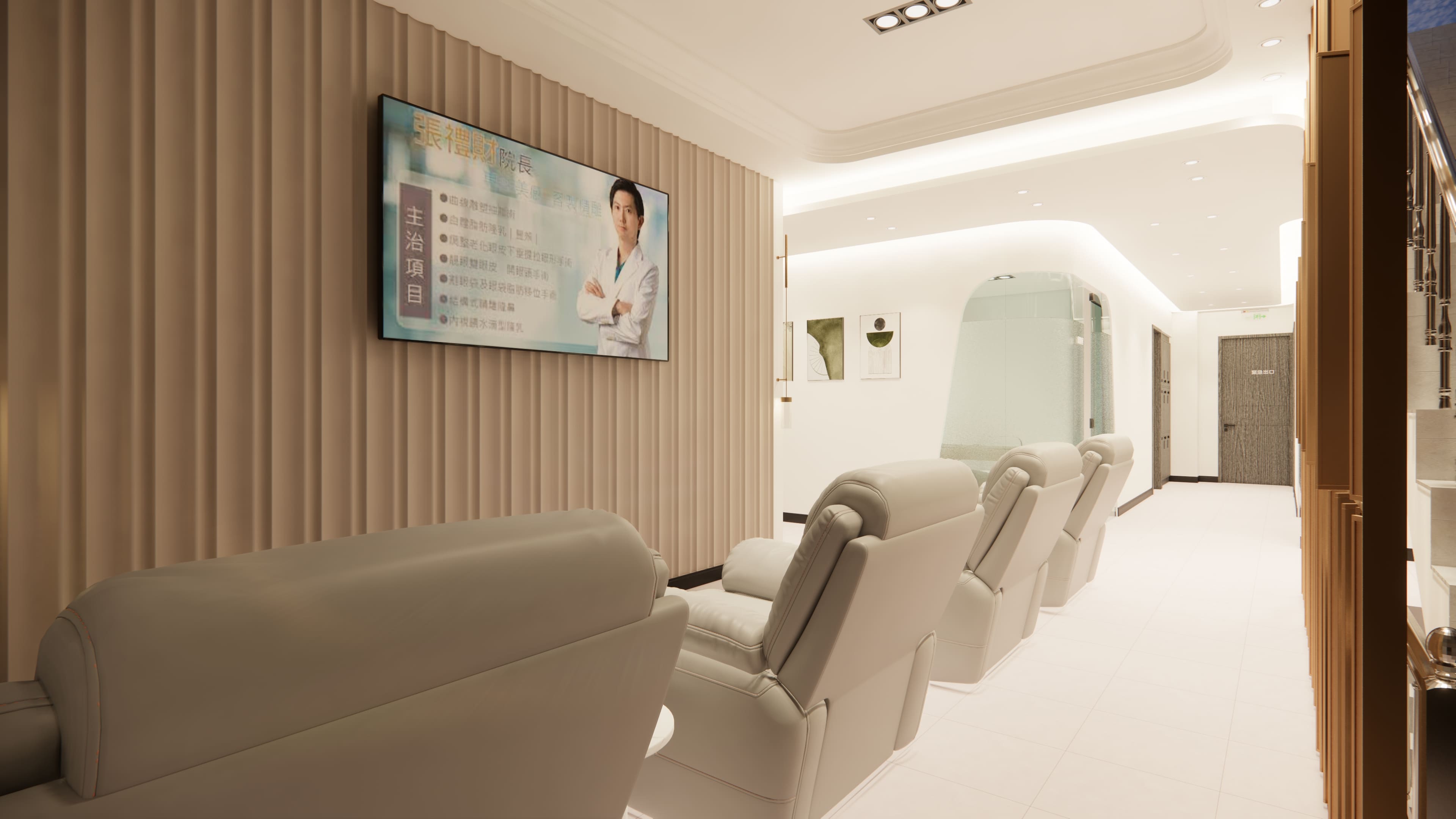 利用開放而不失隱私的玻璃隔間,象徵診所的專業、透明與可信賴。醫師介紹與療程資訊透過數位螢幕呈現,強調專業公開與醫病之間的信任。