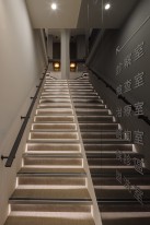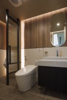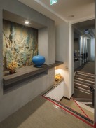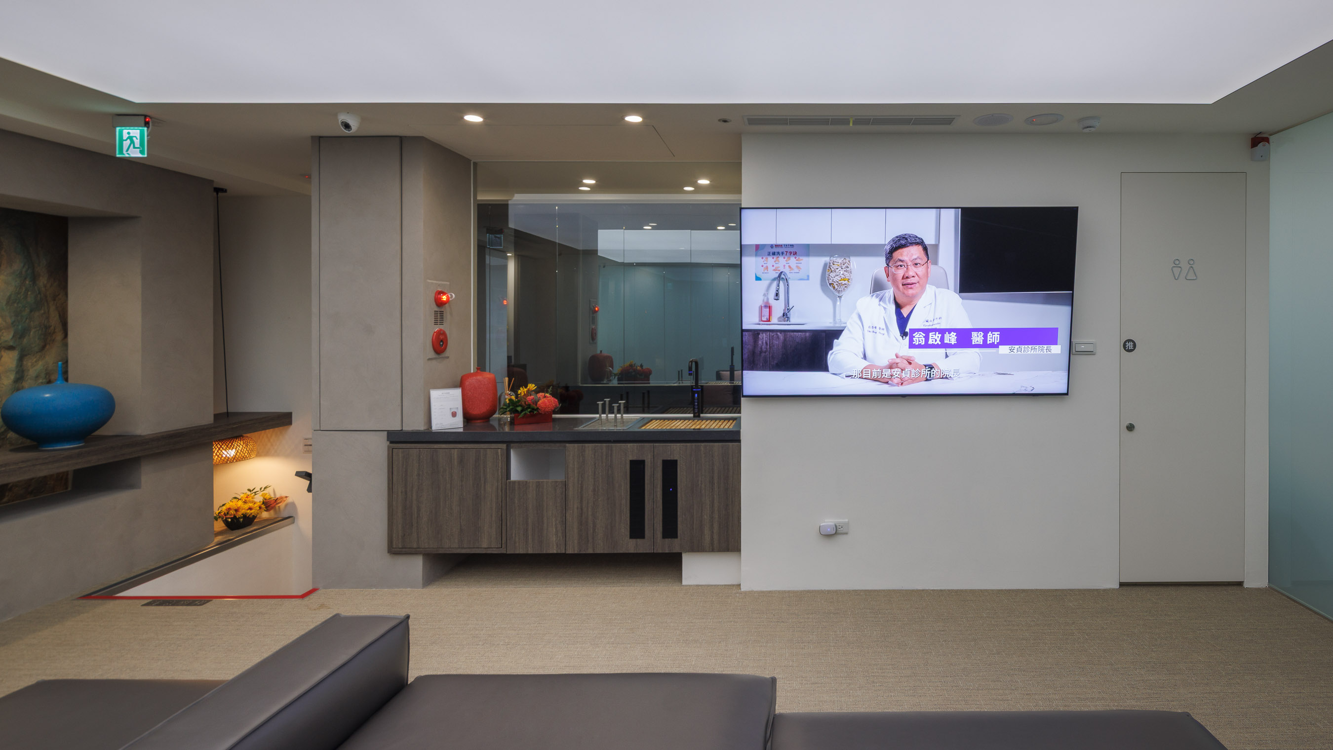 設計不應止於機能,更是情感的轉換點。在安貞診所的過渡空間,我們置入了一面富有原始律動感的岩石主牆,象徵自然力量的恆久與安定。搭配一抹飽滿的靛藍陶瓷,與冷調的清水模牆面形成強烈對話,讓原本單調的廊道轉角化為一方藝術端景。透過木質層板的延伸與暖黃微光的烘托,我們營造出一種「出世」的寧靜感,引導每一位步向診間的患者,在視線移轉間忘卻緊張,重拾內心的平靜。