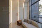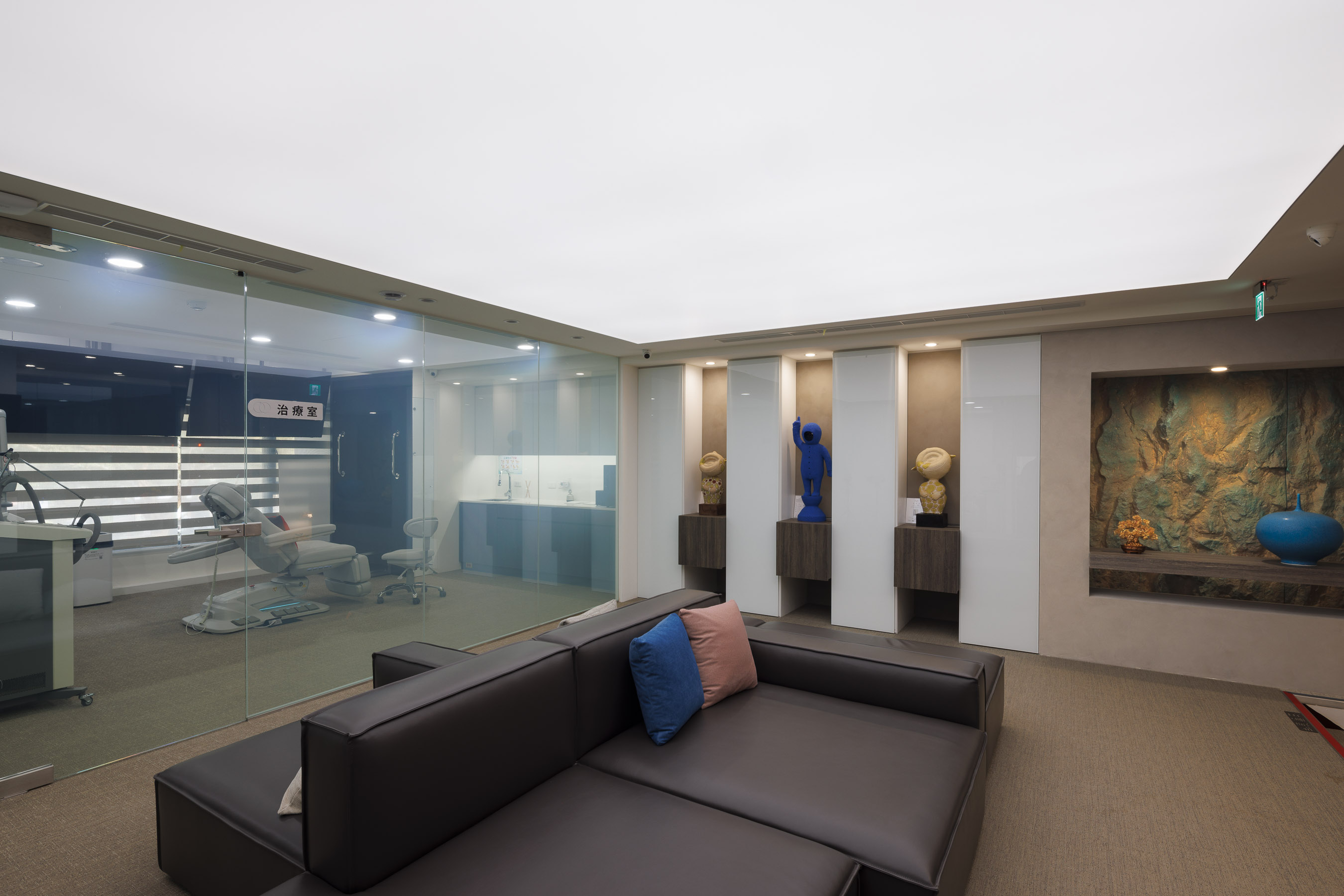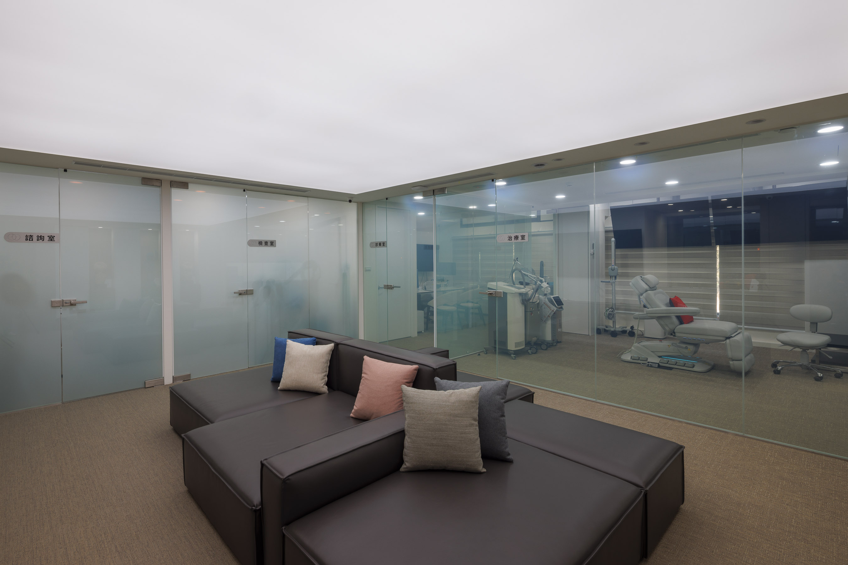 在安貞診所的核心區域,我們大膽運用了大面積的軟膜發光天棚,模擬自然天光的柔和感,消弭了傳統診間低矮天花的壓迫。開放式的視覺佈局,透過高透光玻璃將「治療室」與「候診藝廊」無縫串連,既維持了各區域的獨立性,也極大化了空間的深度。在光影均勻的灑落之下,金屬、石材與軟性皮革交織出和諧律動,將「看診」轉化為一場優雅的空間漫遊。