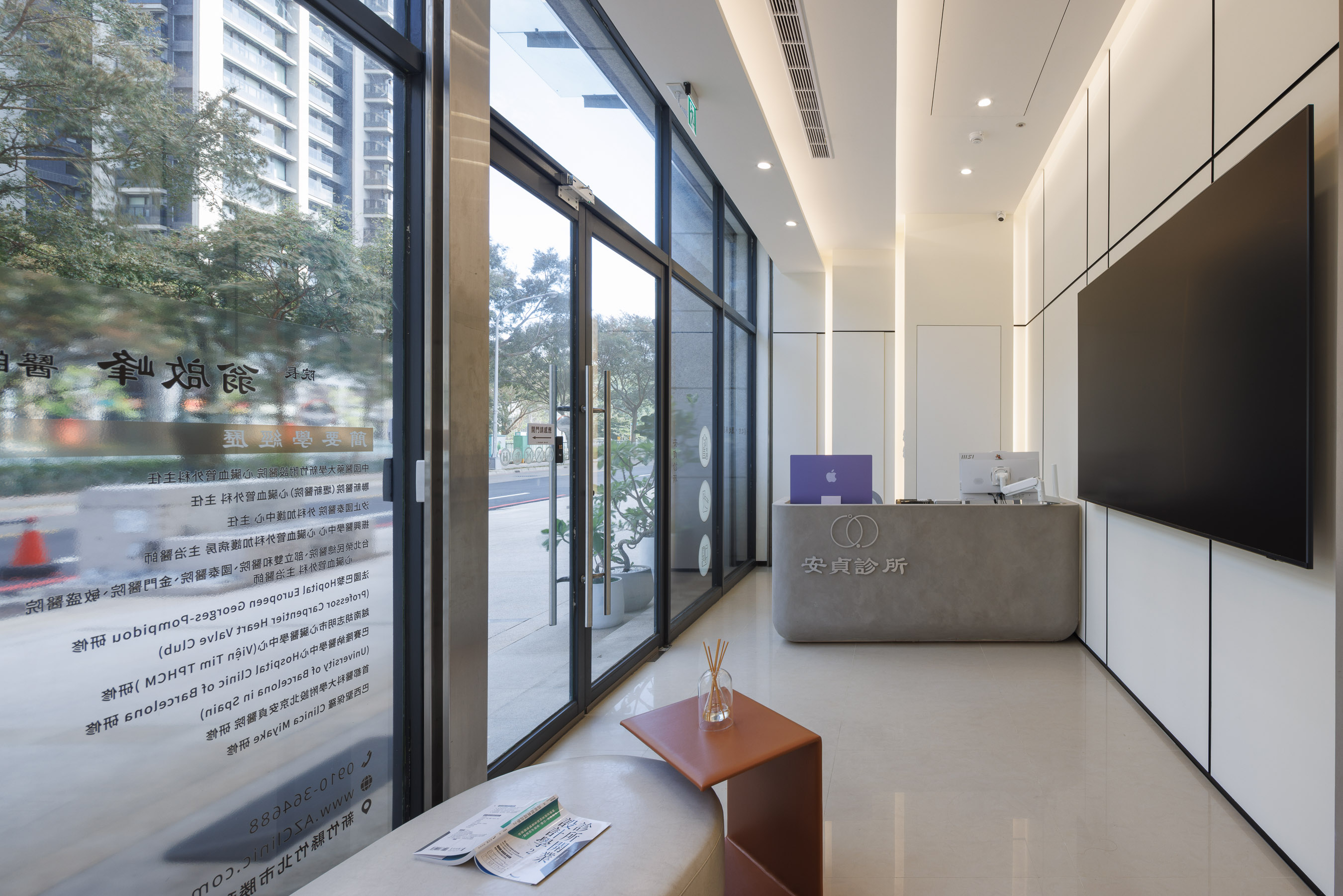 我們在安貞診所的接待區,運用了俐落的線條分割與低彩度的材質語彙,重新定義空間的節奏。 櫃檯採用帶有手作溫度的清水模質感,與後方純白、規律分割的牆面形成「剛與柔」、「重與輕」的對話。內嵌式的線性光源不僅提供了溫和的照度,更引導著視覺的水平延伸。大面積的落地窗將戶外綠意納入室內,讓等待不再是漫長的停留,而是一種沉浸於日光與秩序中的放鬆體驗。